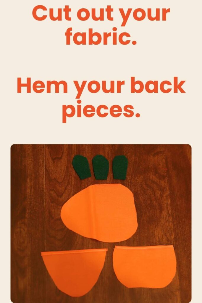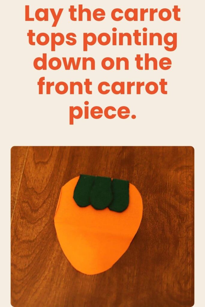 If you’re using felt, you won’t need to hem any raw edges, so you’ll only need 3 carrot top pieces. (this is the method I use in this tutorial!) You’ll also want to cut out the carrot top piece of your paper pattern on the DOTTED line, not the solid line! This will give you a slightly smaller carrot top piece and will make it proportionate to the carrot.